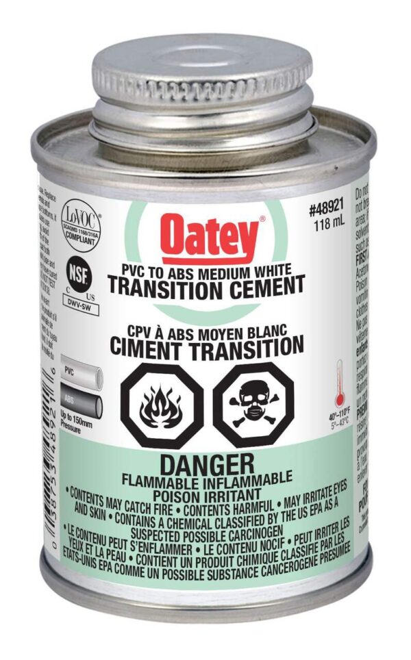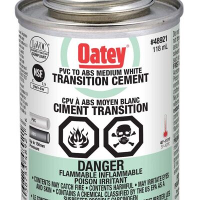 Oatey COL-31532 4oz White ABS to PVC Transition Solvent is a medium bodied has excellent gap filling properties and is easy to apply with included in-lid dauber. This fast set cement can be used to join ABS to PVC in non-pressure transition joints up to 6″ diameter.